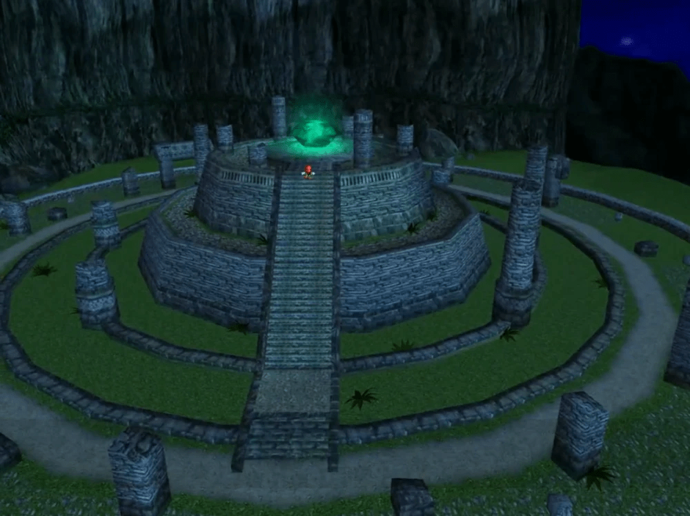 Knuckles returns to his home near the center of the island. We see what remains of some ancient temple. Most of it is decayed and overgrown but at the center is this shrine with seven smaller pillars surrounding a larger one. And on that larger pillar is a gigantic, glowing green gemstone.